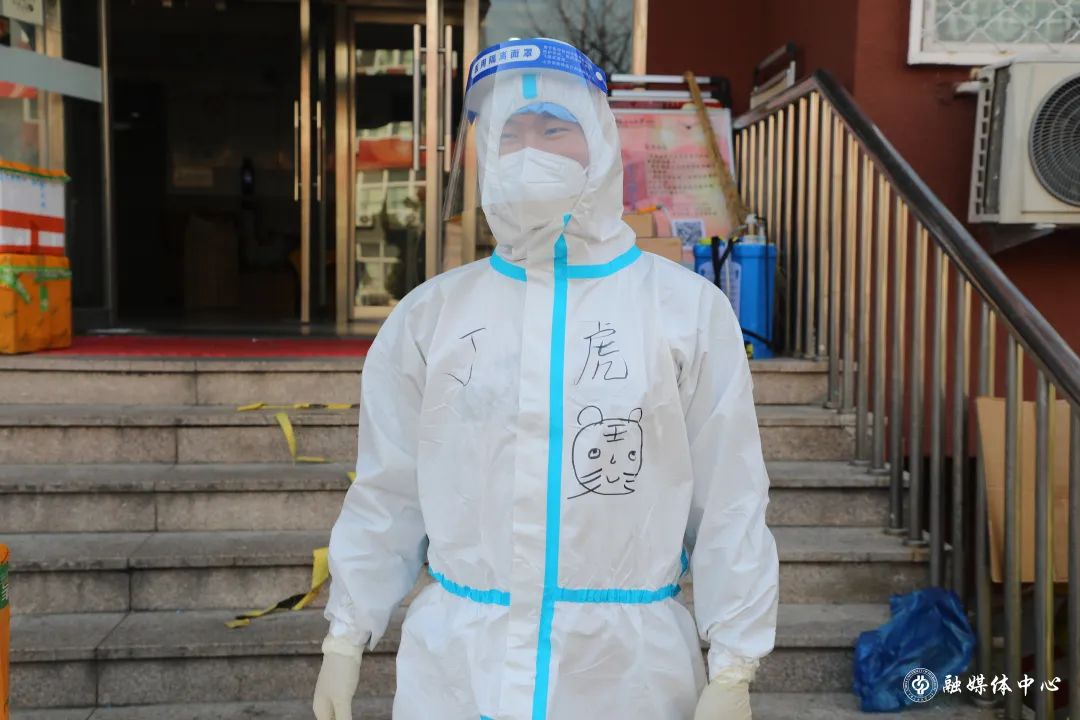 體育與人文藝術學院的丁虎老師在自己的防護服上畫上了一只可愛的小老虎。他的確也是生龍活虎、虎氣十足,幾十斤重的箱子一個人直接拎起,真的是虎虎生威。“心里著急呀,就想著趕緊把東西送到同學們手中”。
