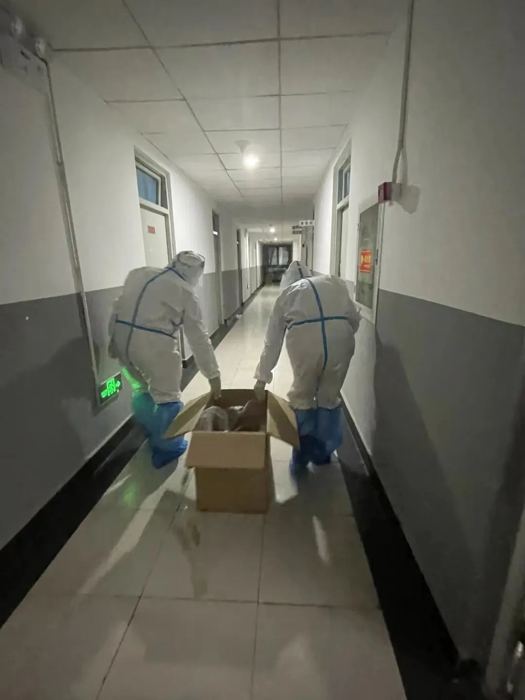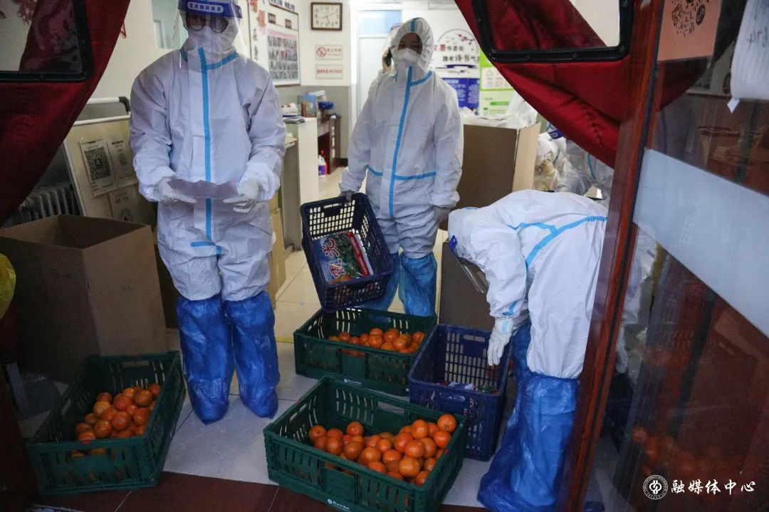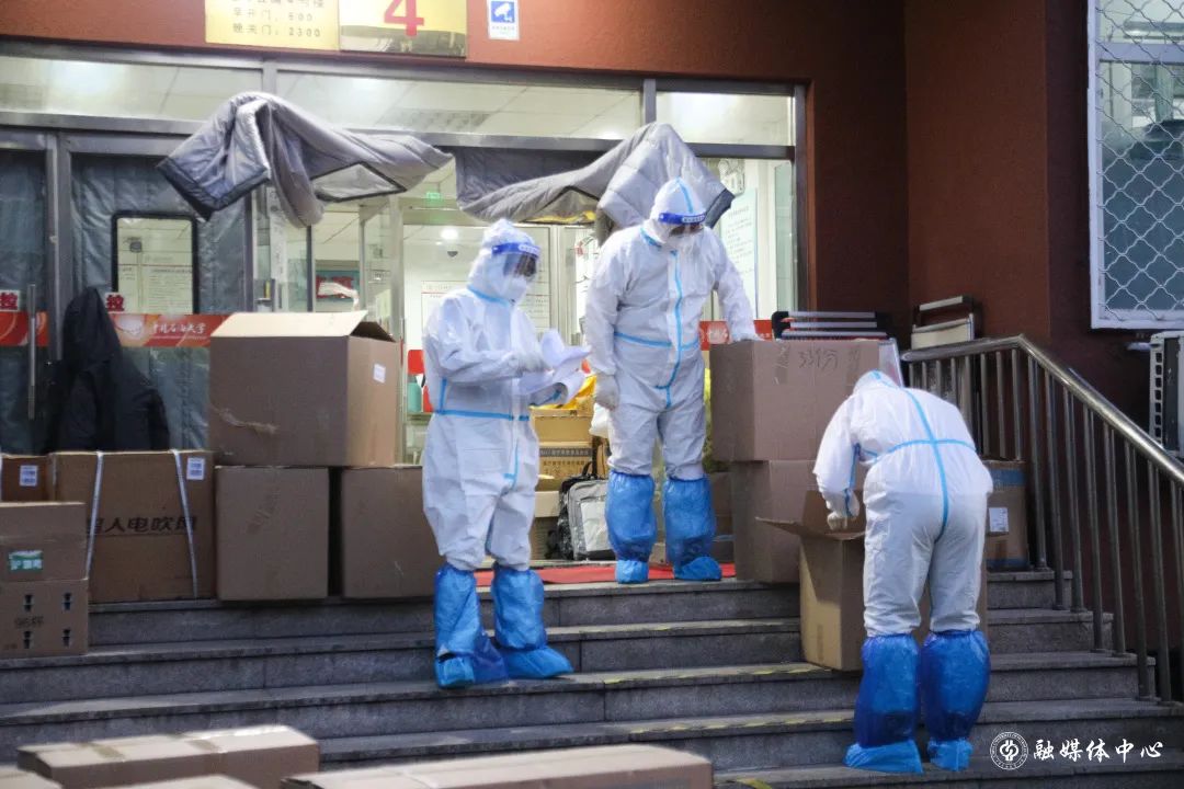 在東校園,像趙振聰這樣的老師還有很多。許多黨員干部主動來到東校園,為學生運送、發放物資。屋外寒風陣陣,因為防護服厚重不透氣,每次送完餐衣服也已經全部濕透。“一天三身汗”“很多老師都感冒了,有些年齡大的老師體力不支,就是在努力撐著,也很心疼。”