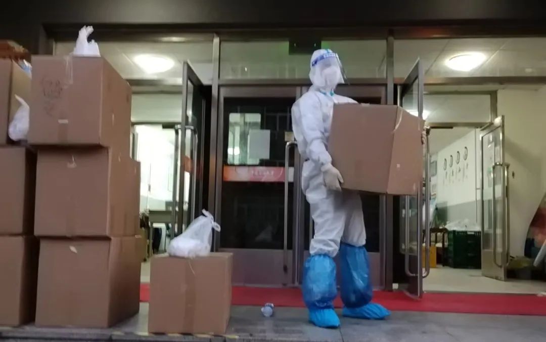 丁拼搏老師和其他志愿者們在東校園一起分發物資,幾天下來對工作強度已經習以為常,可是看到好幾箱學校給學生晚餐配的湯后還是有點“一臉懵”,當天還配送了牛奶、蘋果、梨。“社會各界和學校對學生的關愛,不知道學生感受到沒有,我們搬運工可是切身體會到了,太沉甸甸了!”