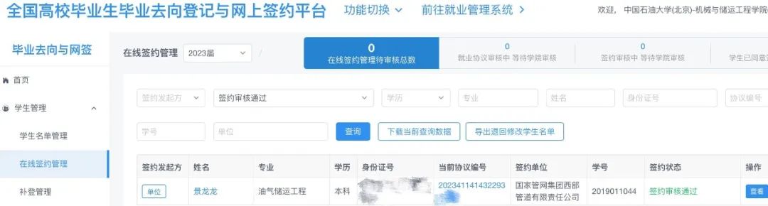 忙著找工作的同學們也沒閑著。油氣儲運工程專業2019級本科生景龍龍懷揣著建設西部的夢想,投遞了很多西部的單位,最終在一百多名面試者中脫穎而出,被國家管網集團西部管道有限責任公司錄用,也成為了學院第一個使用網簽系統的同學。