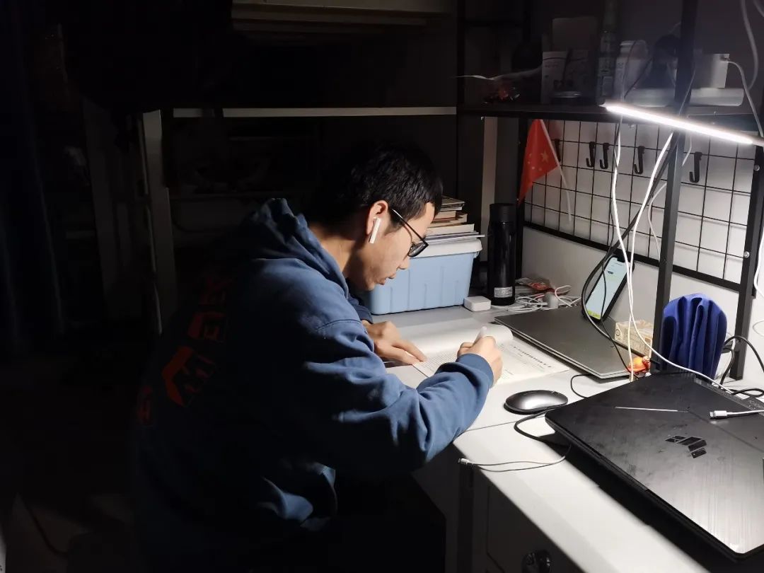 天剛蒙蒙亮,經濟管理學院的王宏達就開啟了一天的學習生活。他戴著降噪耳機,在宿舍最安靜角落的臺燈下沉浸學習。王宏達曾是新疆博爾塔拉職業技術學院的一名老師,他非常珍惜來到中石大讀研的機會,認真聽好每一節課,做好每一頁筆記,平時也經常給舍友講解題目,是名副其實的“王老師”。