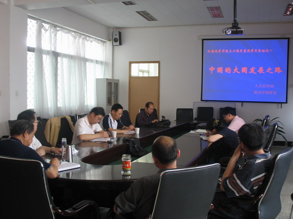 為紀念改革開放30周年,人文社科部政治與公共管理教研室開始舉辦紀念改革開放30年系列學術研討活動,研討活動之一“中國的大國發展之路”學術交流會于近日舉行。會議由龐昌偉教授主持,社科部主任胡新華、副主任李衛紅出席。徐斌、韓英軍兩位副教授分別結合近期在中央黨校研修班的學習經歷做了主題發言,政治與公共管理教研室全體教師參加了討論。