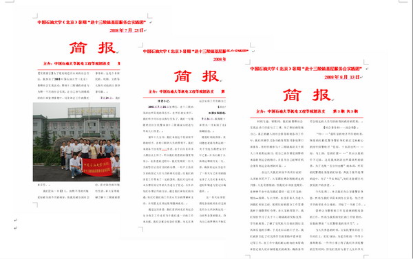 實踐成員分配在鎮政府不同的科室,不僅協助政府工作人員的奧運宣傳、人大補選和社會事務等工作,還積極投身到鐵人三項比賽演練的外圍保障安保服務中。宣教中心的四位實習同學,冒著炎炎烈日,在十三陵鎮各村進行“關于十三陵鎮村民文化素質的提高”的調研,并為十三陵鎮的發展和村民素質的提高提出了可行性建議,受到領導一致好評。實踐期間,實踐團隊高質量、高效率的完成了領導交給的各項工作任務,充分發揚了石大學子“特別能吃苦 特別能戰斗”的鐵人精神,得到了鎮政府一致肯定和高度贊揚。此外,實踐團主動把此次的經歷和感受通過簡報的方式展現出來。