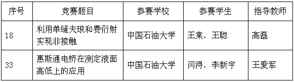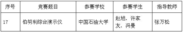 當前位置: 首頁» 院系經緯 我校學生參加首屆北京市大學生物理實驗競賽獲佳績 發布時間:2009-05-21 | 來源:數理系 | 作者:趙昆 | 瀏覽量: 2008年首屆北京市大學生物理實驗競賽已經結束,北京地區共有來自29所高校105個參賽隊的296名同學參加了競賽,13個隊獲一等獎,20個隊獲二等獎,34個隊獲三等獎。我校數理系物理實驗中心組織4個隊共10名同學參加了比賽,其中1個隊獲二等獎、2個隊獲三等獎。我校獲獎名單如下: 二等獎(20項) 三等獎(34項) 分享到: 排行榜 薦讀 中石大召開2024年全面從嚴治黨工作部署會暨... 對口支援中國石油大學(北京)克拉瑪依校區工作... 中石大獲評 “昌平區學習型示范高?!?/h3> 中國石油大學2022年十大新聞揭曉 新年賀詞 | 雄關漫道 惟有登攀