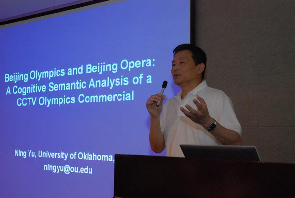 6月17日上午9:00,我校國際交流中心三層報告廳座無虛席。著名國際認知語言學專家、美國 Oklahoma 大學美籍華人於寧教授應邀來校講學,為外語系師生帶來了一場題為“Beijing Olympics and Beijing Opera: A Cognitive Semantic Analysis of a CCTV Commercial”(“北京奧運與京劇––對北京奧運系列廣告的認知語義學分析”)的精彩講座。