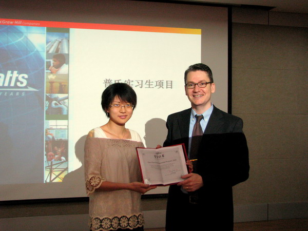最后,王院長宣布,經過論文匿名評審和面試兩個環節,最終由工商管理學院本科06 級國貿專業學生冉婧同學拔得頭籌,獲得了去普氏能源資訊實習的寶貴機會。