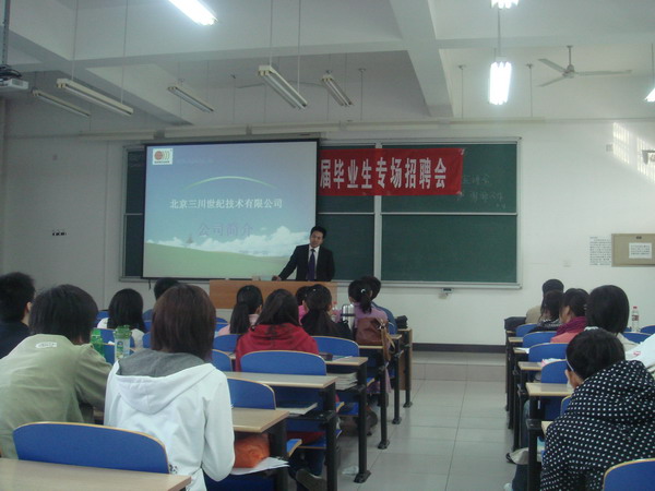 招聘會上北京三川世紀技術(shù)有限公司行政總監(jiān)徐銳經(jīng)先生、北京大森長空包裝機械有限公司人力資源主管王彥周先生和中鼎經(jīng)濟信息服務有限公司總裁張玉良先生先后向廣大畢業(yè)生介紹了本公司的發(fā)展歷史、經(jīng)營狀況和人才需求等基本情況,并就學生關(guān)心的進行了解答。宣講結(jié)束后,三家公司分別對有意向的同學進行了面試和篩選。