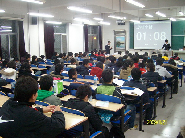 在決賽開始前,劉凌老師對此次學風月辯論賽舉辦的意義及學風建設的重要性做了簡明扼要的闡述,并對參加本次比賽的選手、評委、工作人員及到場觀眾表示感謝。決賽持續了近一個小時,正反雙方圍繞“學風建設主要靠自我約束還是學校管理”展開激烈辯論,經過激烈的唇槍舌戰,最終正方07級二隊奪得冠軍,反方 08級二隊獲得亞軍,最佳辯手為反方四辯曹揚同學。