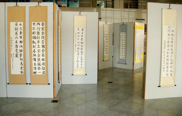 展出的作品均由選修人文社會科學學院開設的《唐詩宋詞賞析》和《書法鑒賞》兩門課程的學生創(chuàng)作。學生們通過這兩門選修課的學習,或賦詩作詞,或揮毫潑墨,以稚嫩卻鮮活而真實的作品書寫了我校大學生勃勃向上的精神風貌。