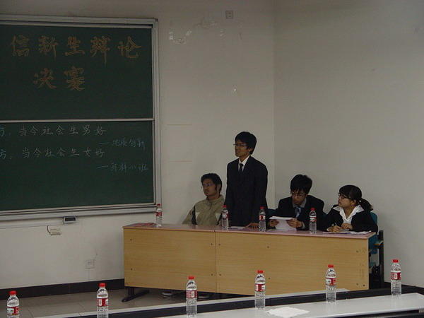 地質09創新班和環科09-1班分別針對“當今社會生男好”和“當今社會生女好”的話題展開辯論。一路坎坷的地質09創新班在經歷奇跡復活并且前一場爆冷淘汰地質09-3班后,在決賽中表現的很積極主動,向對手連番發難;相比之下,之前所向披靡的環科09-1班則表現得稍顯遜色。這場決賽的成功舉辦也給新生辯論賽畫上了圓滿的句號。