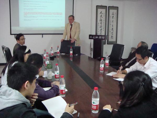 報告會前,伊戈爾·托姆貝爾格研究員與校國際合作與交流處處長孫旭東、人文社會科學學院院長胡新華舉行了座談,雙方就院際交流與合作事宜進行了討論并交換意見。