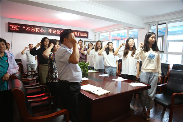 主題黨日活動中,地學院研18-1黨支部為西大莊科村黨支部授予“紅色1+1”共建基地牌匾。雙方黨員齊唱《國歌》,重溫入黨誓詞,并圍繞“不忘初心、牢記使命”主題分別發(fā)言。
