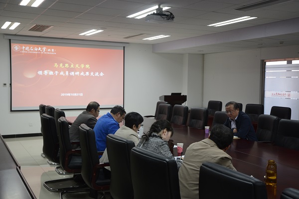 根據《中國石油大學(北京)“不忘初心、牢記使命”主題教育工作方案》要求,石大馬克思主義學院領導班子圍繞貫徹“守初心、擔使命,找差距、抓落實”的總要求,緊密結合學院工作實際有序開展調研,把調查研究結果充分運用于學院工作各環節,大力推進主題教育見實效。10月31日下午,馬克思主義學院召開“不忘初心、牢記使命”主題教育領導班子調研成果交流會。學校黨委副書記雷玉江和學院領導班子全體成員參加會議,會議由學院黨總支書記劉韻秋主持。