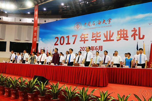 6月29日上午,中國石油大學在體育館舉行2017年畢業(yè)典禮,為順利完成學業(yè)的3817名石大學子送上誠摯的畢業(yè)祝福。校領導山紅紅、張來斌、剛文哲、雷玉江、吳小林、龐雄奇、張士誠,副校級干部鮑志東,以及各學院(研究院)、相關職能部門負責人,教師代表、畢業(yè)生代表、在校學生代表、畢業(yè)生家長代表和校友代表參加了典禮,共同見證2017屆畢業(yè)生開啟人生新的篇章。畢業(yè)典禮由黨委副書記雷玉江主持。