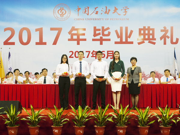 典禮儀式上,赴西部、基層就業(yè)畢業(yè)生,北京市級、校級優(yōu)秀畢業(yè)生分別獲得表彰。2017年,學校積極引導畢業(yè)生樹立“艱苦奮斗、深入基層、獻身事業(yè)”的就業(yè)理念,唱響“到西部去、到基層去、到祖國最需要的地方去”的擇業(yè)主旋律,共有358名優(yōu)秀畢業(yè)生志愿赴西部、基層地區(qū)就業(yè)。2017屆全體學生在校期間刻苦學習,努力鉆研,不斷提高自己的思想政治素質(zhì)和知識能力水平,實現(xiàn)了自身全面發(fā)展,涌現(xiàn)出了一批綜合素質(zhì)優(yōu)秀、品學兼優(yōu)的先進典型,共有205名學生獲得2017年度“北京市普通高等學校優(yōu)秀畢業(yè)生”榮譽稱號,400名學生獲得2017年度“中國石油大學(北京)優(yōu)秀畢業(yè)生”榮譽稱號。