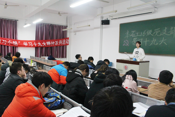 各單位還開(kāi)展了形式多樣、內(nèi)容豐富的活動(dòng)。地球物理與信息工程學(xué)院開(kāi)展教師與學(xué)生寢室結(jié)對(duì)子活動(dòng),學(xué)院教師付建偉、謝豪走進(jìn)學(xué)生宿舍,向?qū)W生宣講十九大精神,與學(xué)生談心,對(duì)學(xué)生進(jìn)行學(xué)業(yè)指導(dǎo),作學(xué)生思想上、學(xué)習(xí)上、行動(dòng)上的領(lǐng)路人;馬克思主義學(xué)院舉辦“十九大精神進(jìn)課堂”藍(lán)墨云示范課,理學(xué)院黨委副書(shū)記楊東杰分享了他在教學(xué)中運(yùn)用藍(lán)墨云的經(jīng)驗(yàn),介紹了如何利用藍(lán)墨云進(jìn)行課程創(chuàng)建、課堂管理、班級(jí)分組討論、資源推送與分享等。石油工程學(xué)院2017級(jí)研究生各黨支部共同舉辦了學(xué)生黨建“六個(gè)一”工程之“學(xué)思踐悟十九大”特色活動(dòng)暨十二月創(chuàng)新組織生活會(huì),石工2016級(jí)本科黨支部舉行了學(xué)習(xí)十九大精神讀書(shū)報(bào)告分享會(huì),支部成員暢談了學(xué)習(xí)十九大精神的體會(huì)和感想。