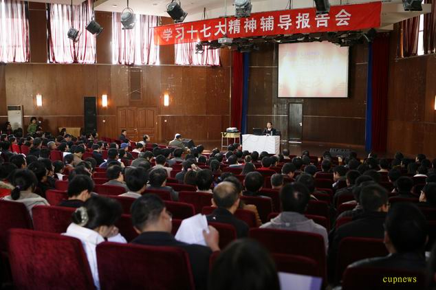 為學習好、宣傳好、貫徹好黨的十七大精神,把全校廣大黨員干部群眾的思想和行動統一到十七大精神上來,11月8日下午,我校在科學會堂舉辦了學習黨的十七大精神輔導報告會,邀請北京市委宣講團成員、中央黨校教授牛先鋒作了題為“奮力開拓中國特色社會主義更為廣闊的發展前景”的報告。
