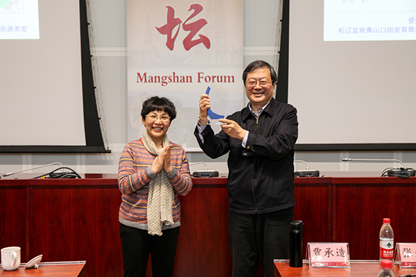 賈承造院士為石大帶來精彩的首期“蟒山講壇”專題報告,報告結束后,山紅紅為賈承造院士頒發“蟒山講壇”紀念牌。