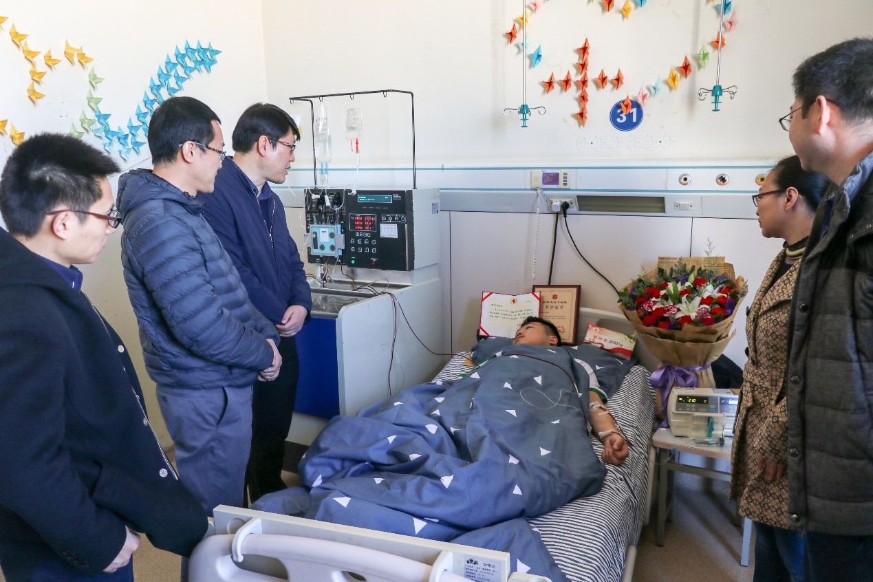 3月7日上午,石大黨委副書記、副校長韓尚峰,學(xué)生工作部(處)、信息科學(xué)與工程學(xué)院、校醫(yī)院等相關(guān)單位負(fù)責(zé)人前往解放軍總醫(yī)院第六醫(yī)學(xué)中心看望慰問倪夢(mèng)凡。中國造血干細(xì)胞捐獻(xiàn)者資料庫北京管理中心、昌平區(qū)紅十字會(huì)等單位相關(guān)領(lǐng)導(dǎo)也來到醫(yī)院對(duì)倪夢(mèng)凡表示關(guān)心和感謝,并為他頒發(fā)了榮譽(yù)證書和紀(jì)念銘牌。