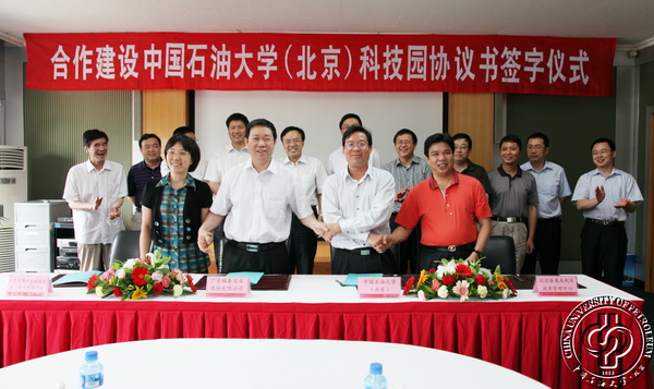 6月18日上午,廣東榕泰實業股份有限公司、北京金惠友創業投資管理中心、北京市昌平區科技交流與合作促進中心與中國石油大學合作建設中國石油大學(北京)科技園協議書簽字儀式在石大翠宮第五會議室舉行。教育部賈一偉處長、昌平區副區長方炎、北京市校辦產業管理中心主任翟士良、北京市科委主管工程師龍華東以及昌平區科委、財政局、招商局、中關村科技園區昌平園管委會和三家共建企業的有關領導,校長張來斌,副校長徐春明,以及學校相關職能部門、學院和校產總公司的負責人共40多人參加了簽字儀式。簽字儀式由徐春明主持。