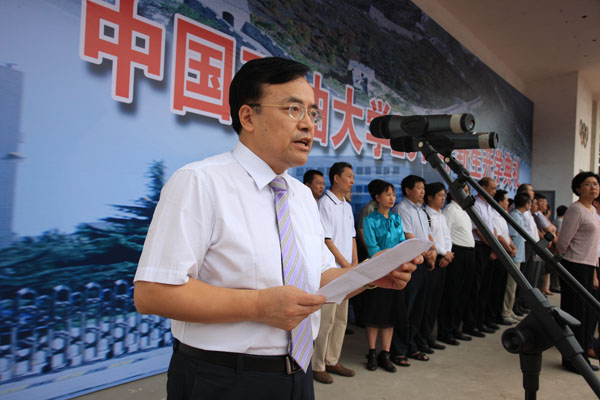 校長張來斌在典禮上致辭。他講到,中國石油大學辦學57年來,已經為社會培養了10多萬名優秀人才,其中包括黨和國家的領導人、杰出的科學家、成功的企業家、優秀的工程師和石油石化等各行各業的精英。新生的到來,為石大校園增添了蓬勃生機和活力,石大將因為新生的到來而更加精彩。他表示,新生們踏入了中國石油大學的學術殿堂,石大將與同學們一起成就大學的理想,同時也與同學們成就一段人生的精彩篇章!