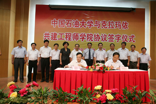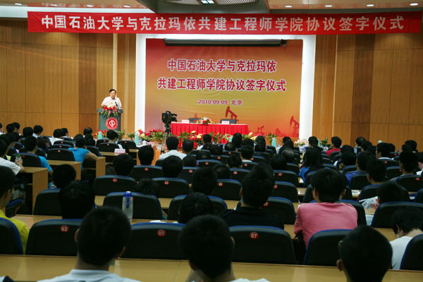 9月9日下午,中國石油大學與克拉瑪依共建工程師學院簽字儀式在石大翠宮二樓報告廳隆重舉行。教育部直屬高校工作司巡視員陳志龍,克拉瑪依市委副書記、市長、新疆油田公司總經理陳新發,克拉瑪依市委常委、新疆油田公司副總經理孫曉崗,克拉瑪依市副市長趙武生,中國石油大學全體校領導出席了簽字儀式,全校二級干部和各院系教師代表及學生代表參加了儀式。簽字儀式由中國石油大學黨委書記蔣慶哲主持。
