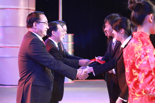 中國石油天然氣集團公司總經理助理李萬余、中國海洋石油總公司副總經理呂波、中國石油化工集團公司人事部副主任傅興順(從左至右)為獲獎學生頒獎