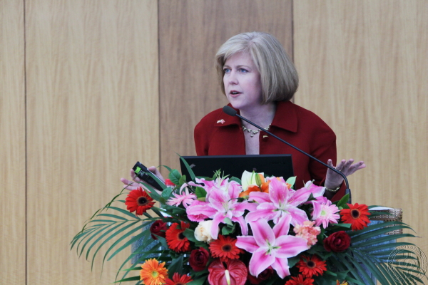 Cheryl Matherly應邀作了以“高等教育國際化:美國案例研究”為主題的報告,她從學術研究、實踐經驗兩個角度簡要介紹了美國高等教育國際化的概念、發展趨勢,以及圖爾薩大學國際化發展的歷程與成果。