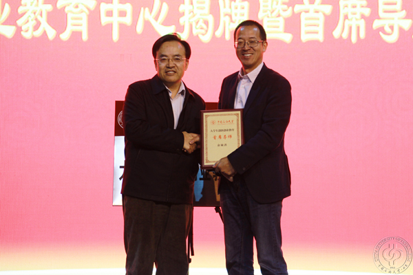 儀式上,石大聘請俞敏洪擔(dān)任中國石油大學(xué)創(chuàng)新創(chuàng)業(yè)教育首席導(dǎo)師,張來斌為俞敏洪頒發(fā)聘書。
