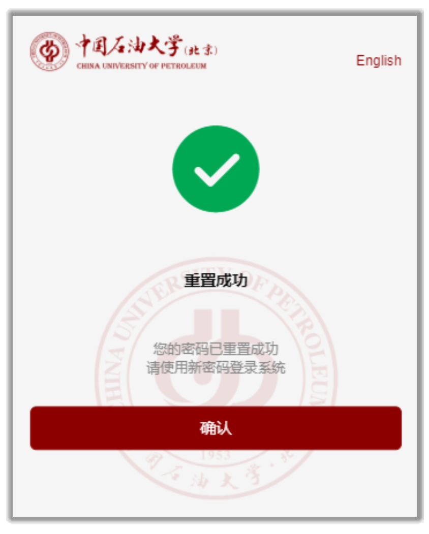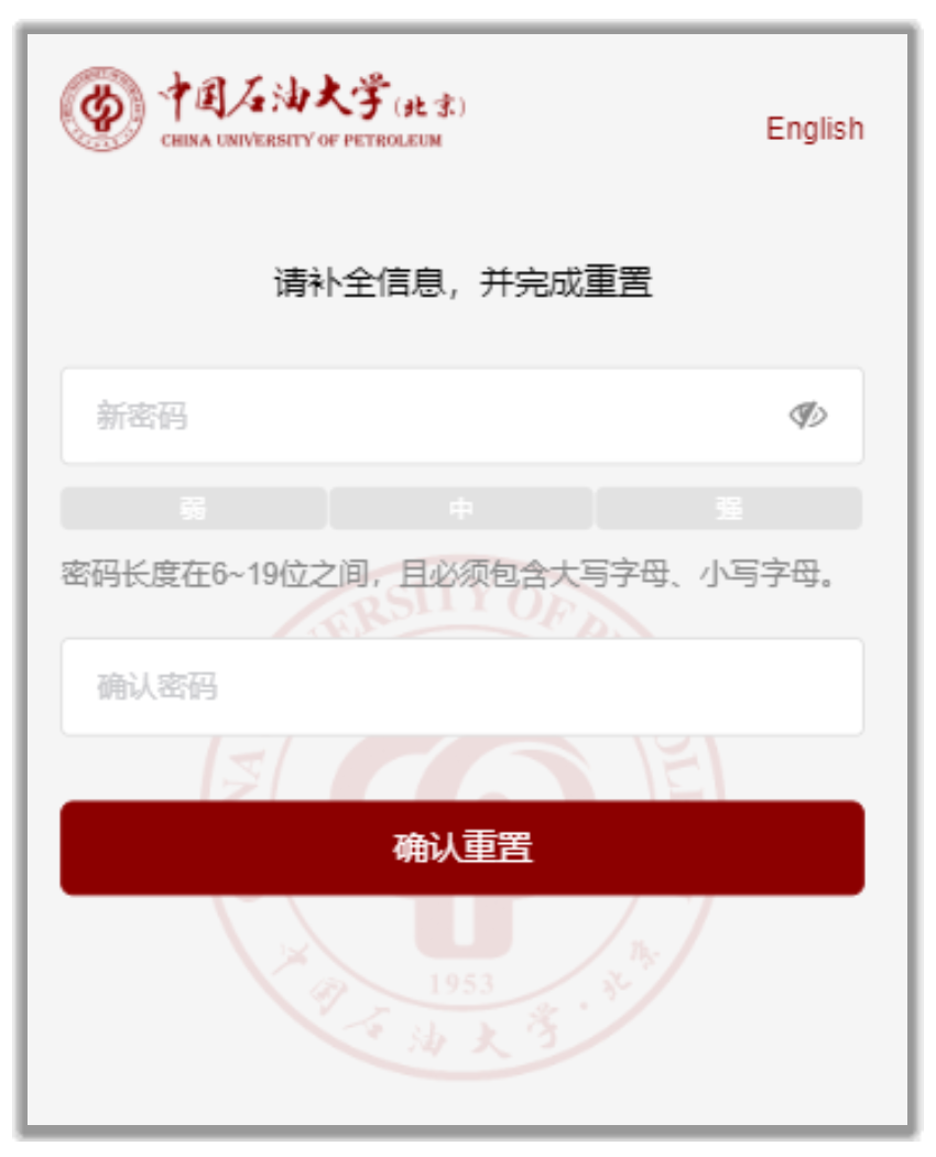 輸入您選擇的新密碼,點擊第一個文本框內的眼形圖標則文本款內顯示密碼明文,此時只需輸入一遍密碼,再次點擊關閉明文密碼顯示。點擊“確認重置”,若密碼符合系統強度要求,則頁面提示密碼重置成功,可使用新密碼登錄系統。