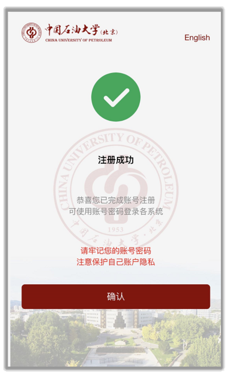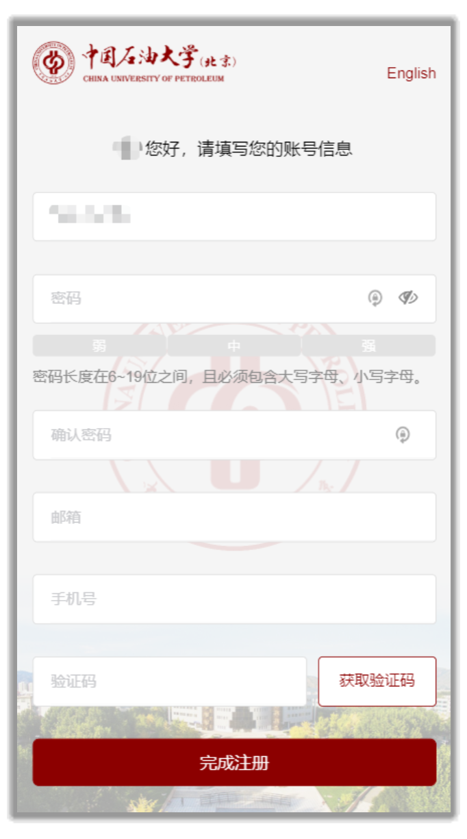 4、填寫賬號相關信息:密碼、個人郵箱、手機,并獲取短信驗證碼后填入,賬號默認為學號/工號,無需修改,點擊“完成注冊”,若信息檢驗失敗請根據提示進一步完善信息,若信息無誤則跳轉至注冊成功頁面,此時關閉頁面即可。可通過學號/工號及注冊過程中設置的個人密碼登錄已接入統一認證的應用系統。