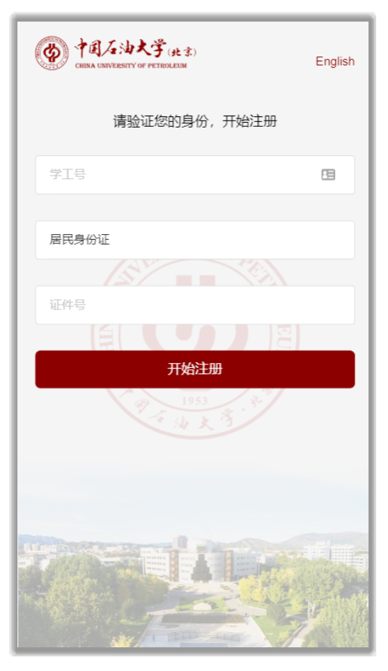2、輸入學工號和證件信息,點擊“開始注冊”。