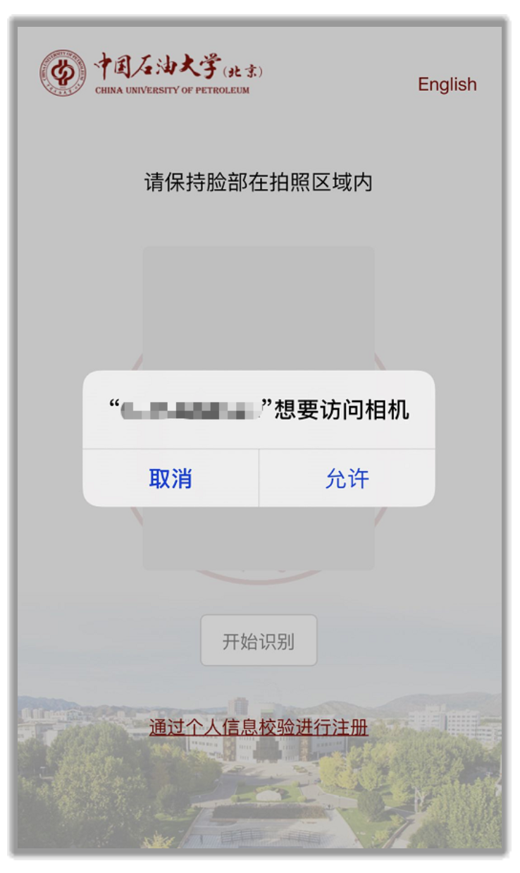 3、如果系統出現彈窗請求訪問攝像頭權限,請點“允許”,當頁面出現攝像頭畫面,請將面部正對攝像頭,然后點擊”開始識別”,識別通過即進入賬號設置頁面