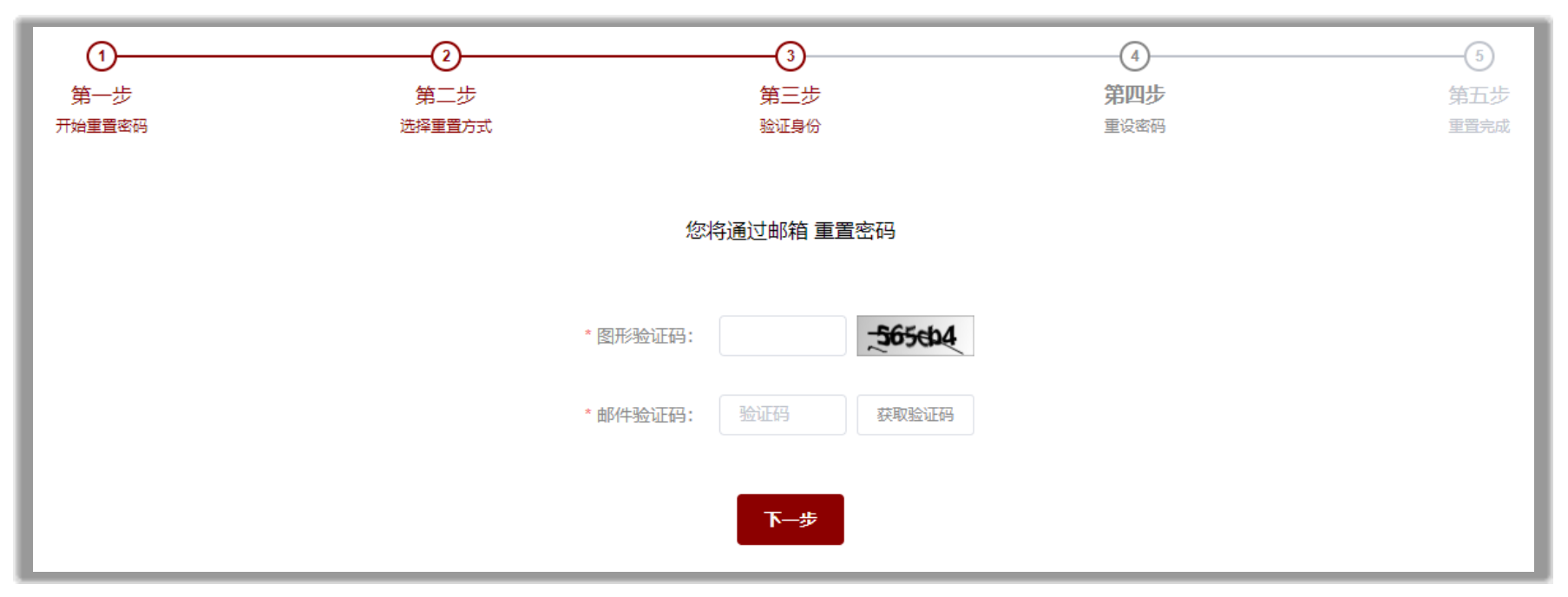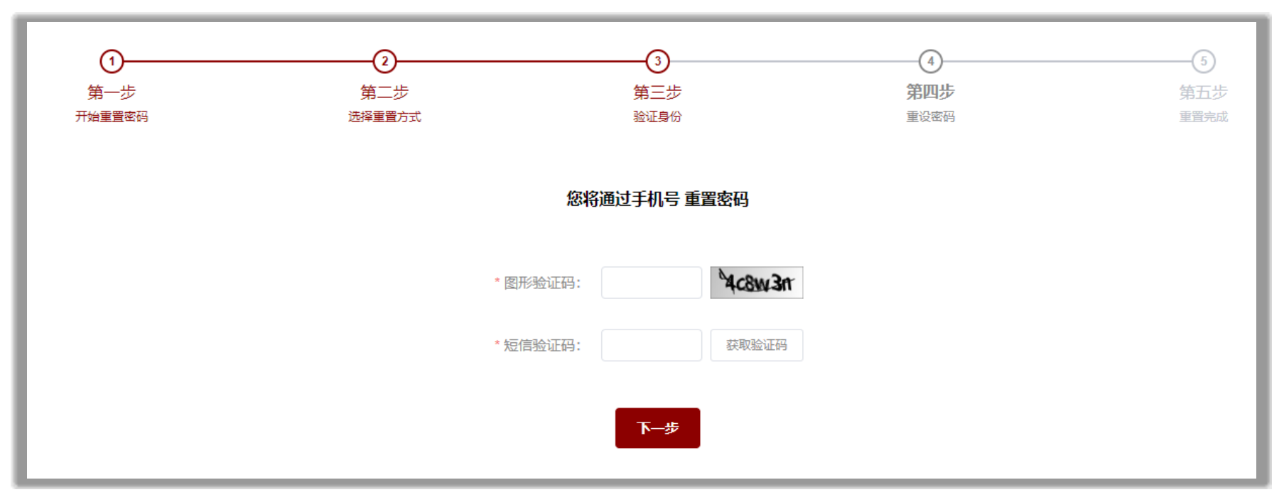 輸入圖形驗證碼并點擊“獲取驗證碼”,若圖形驗證碼無誤則系統會將短信驗證碼發送至您預留在系統的手機號,輸入后點擊下一步,若驗證無誤則進入重置密碼頁面;