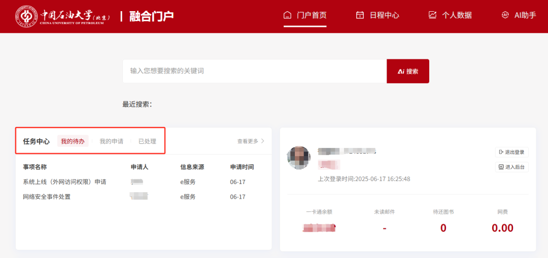 1、任務(wù)中心:集成“e服務(wù)”平臺(tái)、財(cái)務(wù)系統(tǒng)待辦/申請(qǐng)/已處理事項(xiàng),同步推進(jìn)OA協(xié)同、財(cái)務(wù)任務(wù)等任務(wù)接入,打造全校統(tǒng)一事務(wù)管理中心。