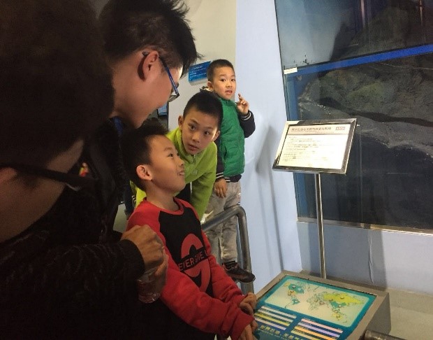 館中還展覽了能源革命、海洋開發等,我們時時停足觀望,相互討論。在海洋鉆井平臺展塊,許多中小學生被海洋石油開采等裝置所吸引,我們俯下身子把自己所學的專業知識分享給小學生們,即使蜻蜓點水般的講解,孩子們依然聽得津津有味。