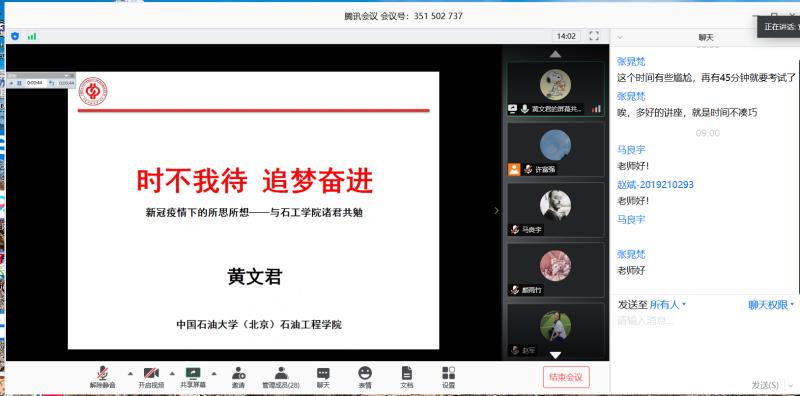 2020年6 月6日上午9:00-10:30,石油工程學(xué)院“思而博智,學(xué)而昊晟”講座暨學(xué)術(shù)人生講座(第五期)在騰訊會(huì)議圓滿舉行。校青年拔尖人才黃文君擔(dān)任主講,活動(dòng)由研會(huì)許富強(qiáng)主持。