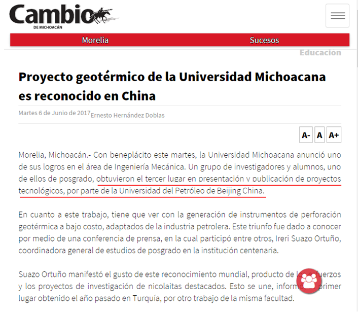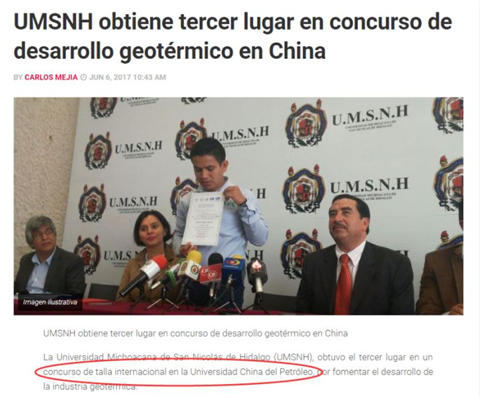 墨西哥多家媒體對U.M.S.N.H的學生來中國參加博士生論壇并獲獎一事進行了報道。報道稱,博士生論壇活動是具有國際視野的交流活動,U.M.S.N.H的學生參賽作品圍繞地熱這一主題進行研究,其成果將會對墨西哥乃至世界石油行業發展的產生影響,充分體現了本次全國博士生學術論壇對于推進石油行業技術發展的重要意義。