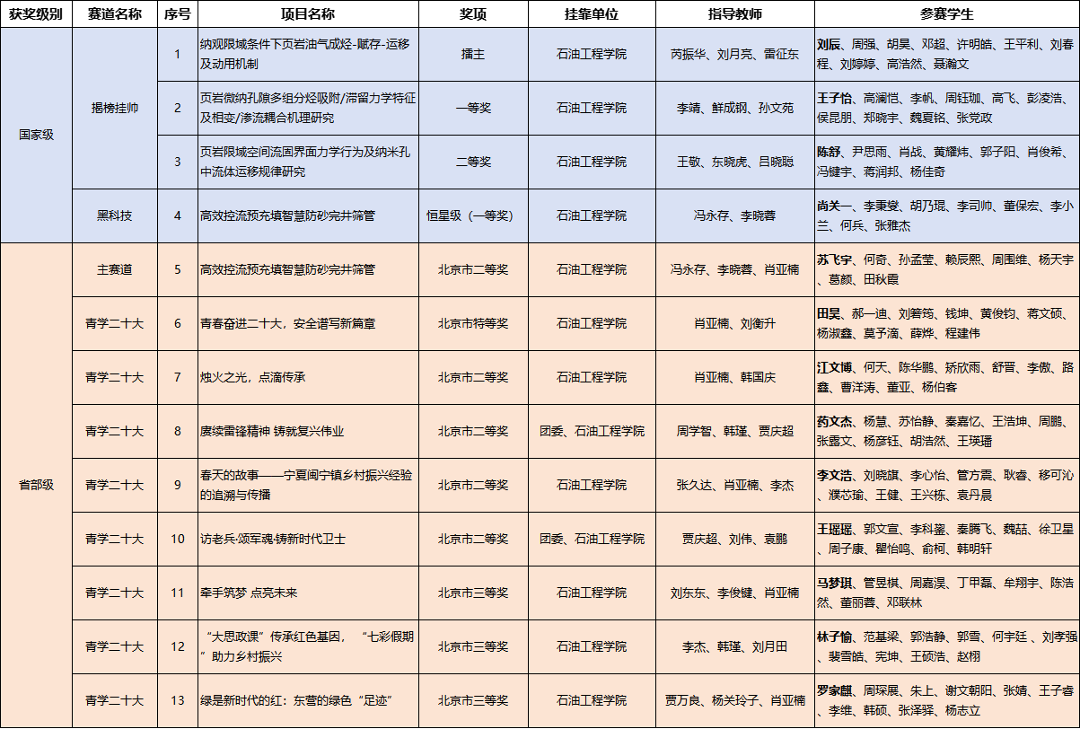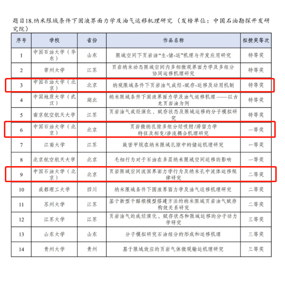 在 “揭榜掛帥”專項賽中獲得全國特等獎1項(擂主)、全國一等獎1項、全國二等獎1項,在賽題18——納米限域條件下固液界面力學及油氣運移機理研究中獲得全國最好成績!