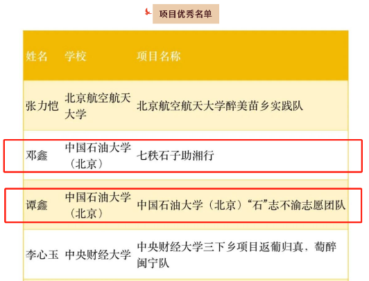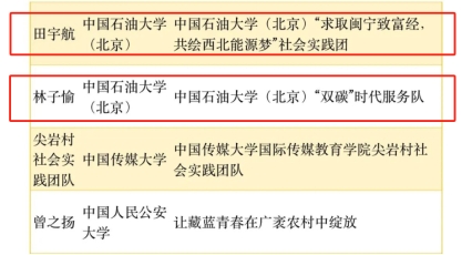 2023年11月13日,由中國青年報(bào)社主辦的2023大學(xué)生社會(huì)實(shí)踐成果“千校千項(xiàng)”網(wǎng)絡(luò)展示活動(dòng)公布獲獎(jiǎng)團(tuán)隊(duì),中國石油大學(xué)(北京)石油工程學(xué)院的“七秩石子助湘行”、“石”志不渝志愿服務(wù)隊(duì)、“雙碳”時(shí)代服務(wù)隊(duì)和“求取閩寧致富經(jīng),共繪西北能源夢”4支社會(huì)實(shí)踐隊(duì)伍獲評(píng)優(yōu)秀項(xiàng)目團(tuán)隊(duì)。