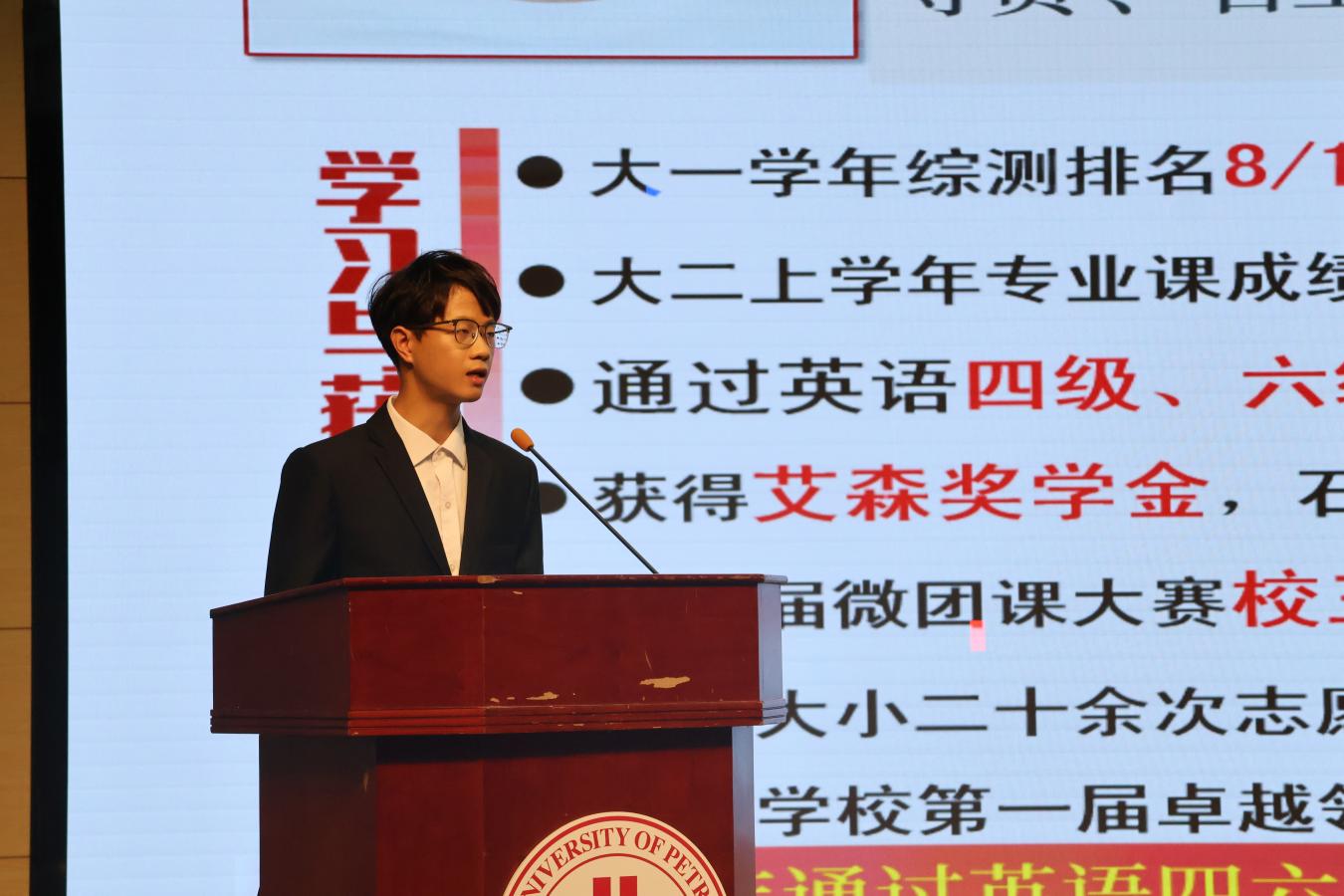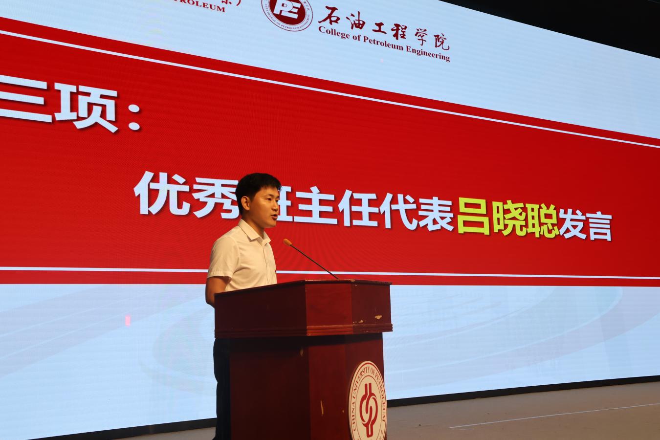 2022級本科生張澤驛作為朋輩輔導員代表發(fā)言。他分享了本科三年的學習、科研、實踐、社會工作經(jīng)驗,勉勵同學們堅持對理想的不懈追求、躬耕自己的精神田園,并祝愿大家在中石大石油工程學院綻放最美的光彩。