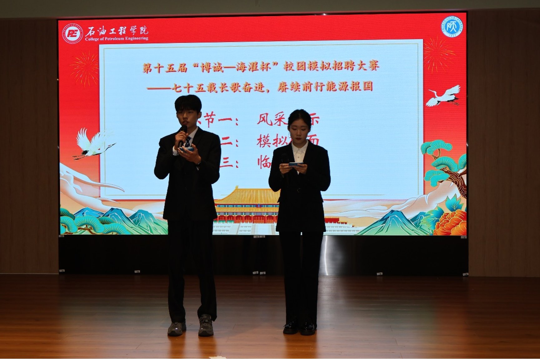 本次大賽以“七十五載長歌奮進,賡續前行能源報國”為主題,由共青團中國石油大學(北京)石油工程學院委員會主辦、石油工程學院研究生會承辦,得到了北京石大博誠科技有限公司和陜西海濯能源有限公司的聯合贊助。北京石大博誠科技有限公司副總經理王小東、總經理助理馮奇、市場部經理黃耀存,陜西海濯能源有限公司程濤,石油工程學院輔導員李杰受邀參加本次決賽并擔任評委,來自不同學院、年級的9位優秀選手闖入決賽同臺競技,為現場110余位觀賽同學帶來了一場求職盛宴。