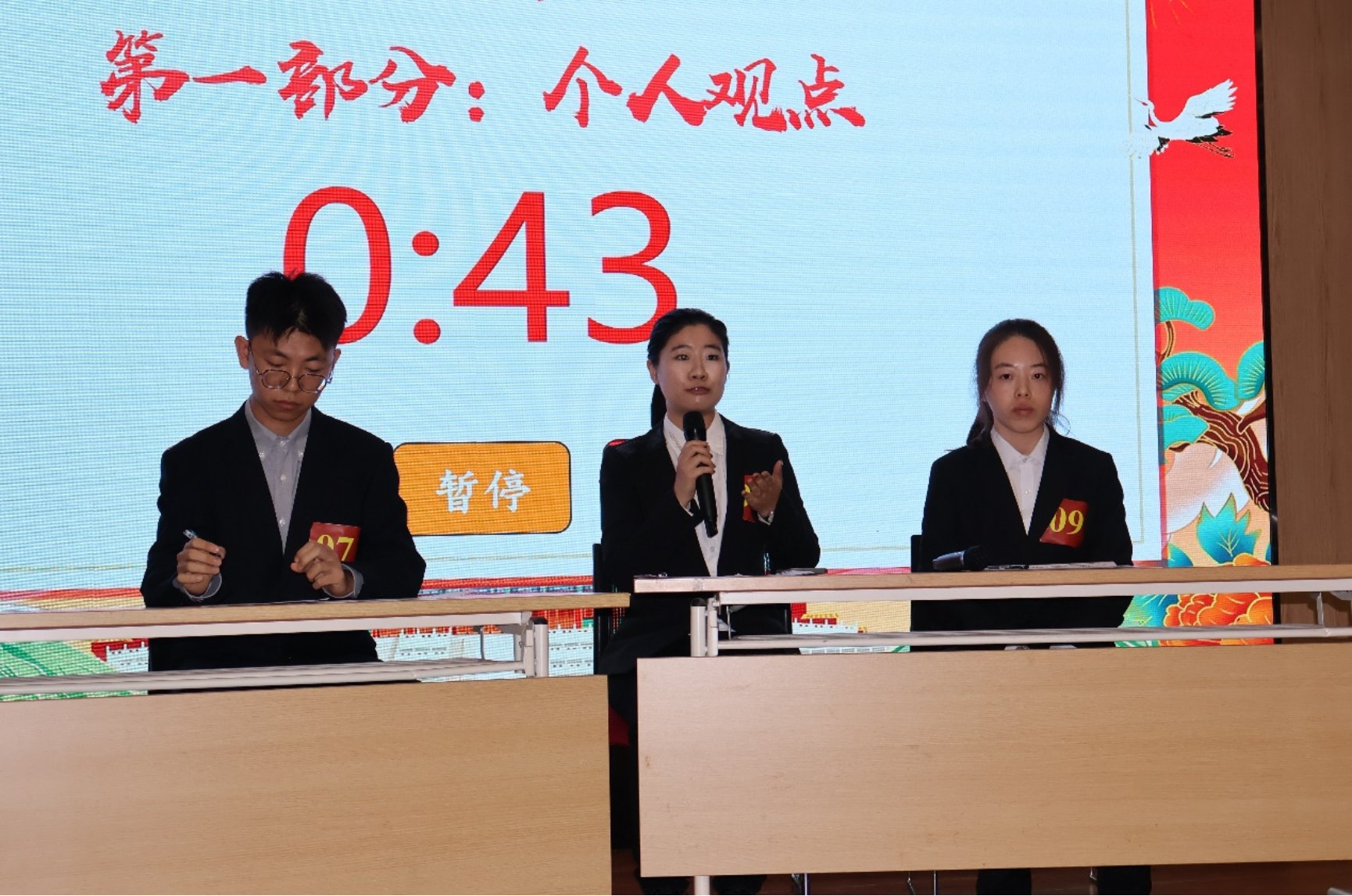 第二個環節為“模擬群面”。9名選手依次分為三組,在規定時間和特定情境下完成個人觀點表述、小組自由討論、代表總結陳述。三組選手在自由討論中進行思想碰撞,在互動和反饋下形成了積極、有序的討論氛圍,由代表同學總結發言,提出了集思廣益的建議。