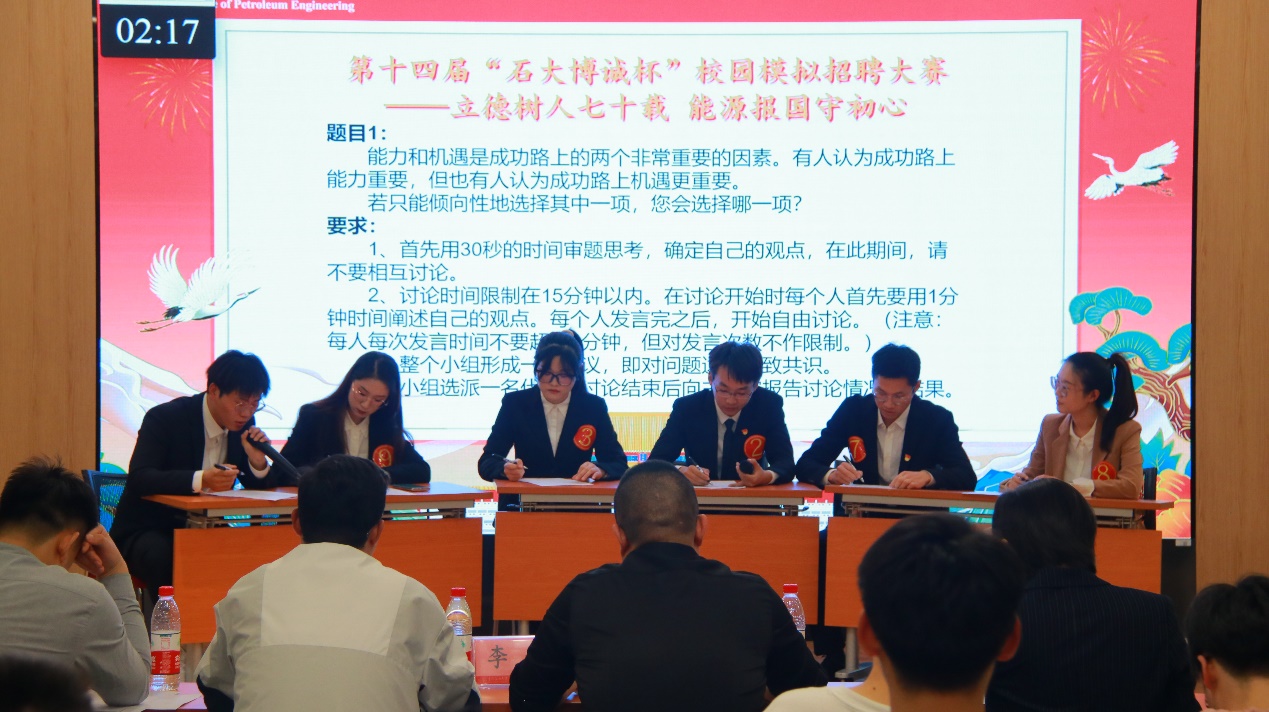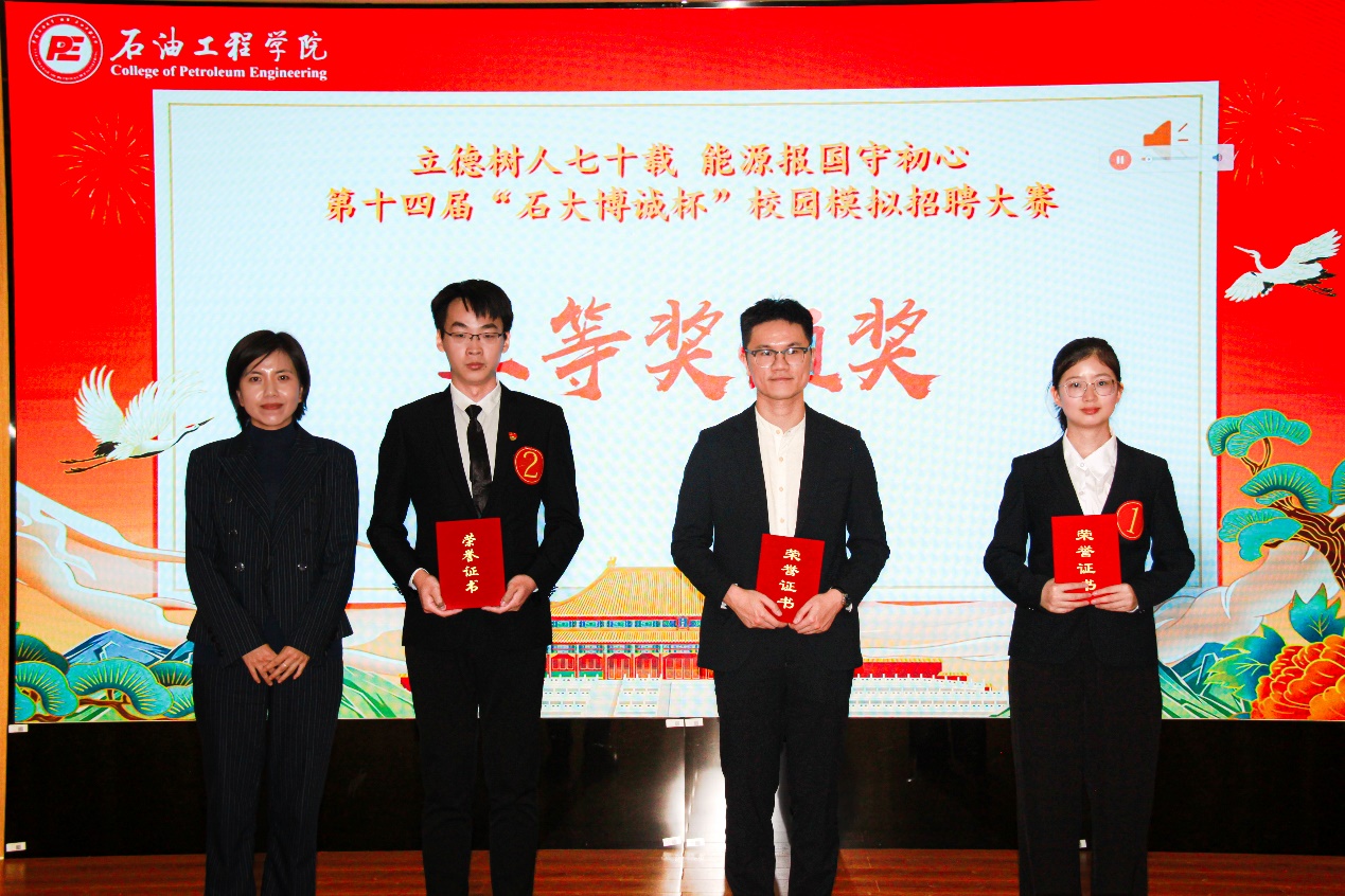 為落實學校關于開展“2024屆畢業(yè)生就業(yè)指導服務月”活動要求,幫助學生找準職業(yè)目標,感受真實求職場景,討論職場核心議題,搭建廣大學子從校園到職場溝通橋梁。由共青團中國石油大學(北京)石油工程學院委員會主辦、石油工程學院研究生會承辦的第十四屆"石大博誠杯"校園招聘模擬大賽決賽于10月14日在學生活動中心410舉行。本次大賽由北京石大博誠科技有限公司獨家贊助。北京石大博誠科技有限公司副總經理李磊、北京石大博誠科技有限公司實驗室主任王小東、千鋒互聯(lián)人力資源總監(jiān)陳菲菲、石油工程學院團委書記肖亞楠、石油工程學院輔導員,第27屆研會指導老師劉衡升受邀參加本次決賽并擔任評委。