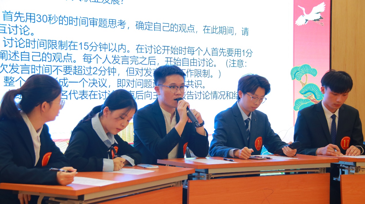 經過前期學生自薦、簡歷篩選、評委審核,共有來自全校各個學院的 11 名同學脫穎而出進入決賽,角逐桂冠。本次模擬招聘大賽決賽分為三部分,分別為“風采展示”、“模擬群面”、“臨場應變”,每個環(huán)節(jié)由評委分別進行打分,最后公布總成績及獲獎名次。