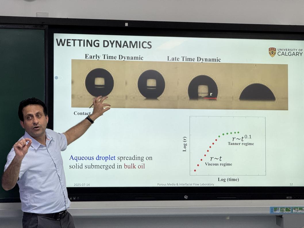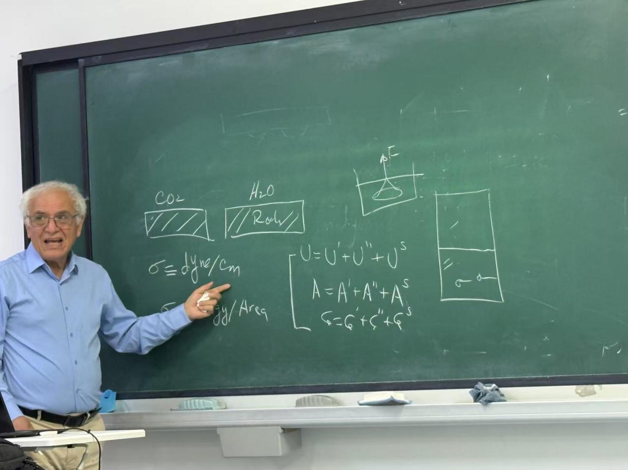 Firoozabadi教授系統闡釋了體相與界面熱力學及其在地下流體流動與熱能開采中的應用理論體系。首日課程聚焦熱力學基礎與相態演化,Firoozabadi教授通過嚴謹的公式推導,結合《油氣藏熱力學》教材和相關學術論文,解析重力場與毛細管力場耦合作用下的三相平衡機制。次日課程深入工程實踐核心,Firoozabadi教授以狀態方程為例,強調閃蒸計算在碳封存設計中的關鍵作用,并同步關聯教材內容強化理解。第三日課程轉向學科前沿,Firoozabadi教授通過相場法動態模型展示裂縫擴展機理,揭示界面張力與線張力對壓裂液行為的控制規律。Hossein Hejazi教授的壓軸報告呈現了重油開采技術突破,通過高溫高壓微觀實驗影像,直觀展示高溫乳化劑誘導的原位油包水乳液在巖石孔隙中的流動特性,結合界面流變學數據定量解析剪切應力對液滴斷裂的調控機制,為重油開采提供了全新解決方案。課程間隙,聆聽課程的同學和老師與Firoozabadi教授、Hossein Hejazi教授深入交流探討,啟發新的研究思路。
