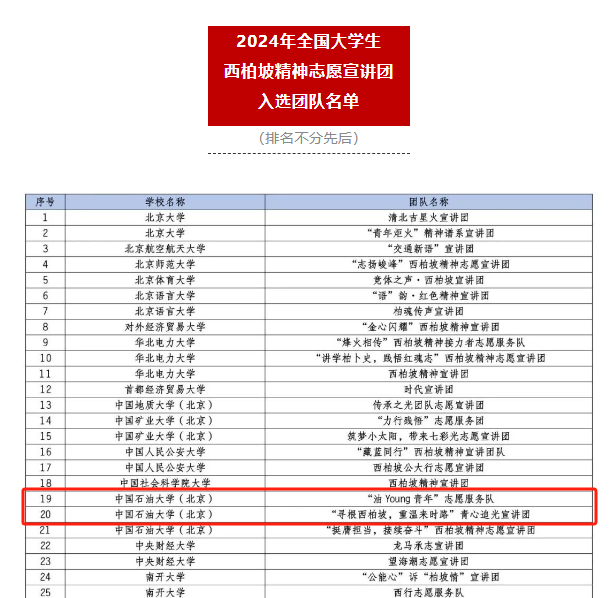 活動得到了各高校志愿服務(wù)團隊的廣泛關(guān)注和積極參與。主辦單位對所有材料進行了認真審閱,最終共有來自北京大學(xué)、南開大學(xué)、陜西師范大學(xué)等809所高校的1000支大學(xué)生志愿服務(wù)團隊入選。石油工程學(xué)院“油 Young 青年”志愿服務(wù)隊、“尋根西柏坡,重溫來時路”青心追光宣講團兩支團隊成功入選(全校僅3支)。