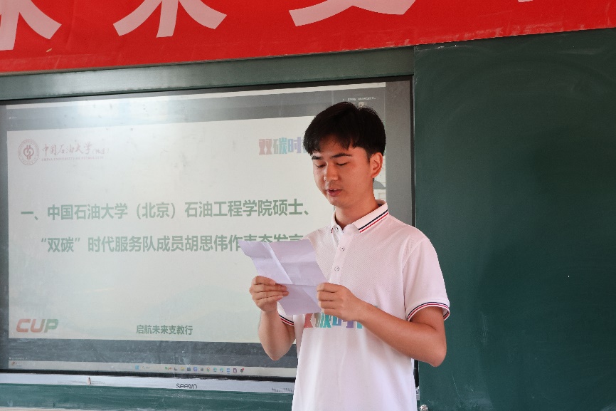 “雙碳”時(shí)代服務(wù)隊(duì)成員胡思偉作為成員代表作表態(tài)發(fā)言,表示將會(huì)以雙重身份投入到夏令營(yíng)活動(dòng)中,既做播撒知識(shí)種子的老師,又做走近學(xué)生內(nèi)心世界的朋友,希望通過(guò)此次活動(dòng)將“紅色精神”“傳統(tǒng)文化”“能源報(bào)國(guó)”的種子播撒在學(xué)生們的心間,用實(shí)際行動(dòng)展現(xiàn)新時(shí)代能源學(xué)子的責(zé)任擔(dān)當(dāng)。
