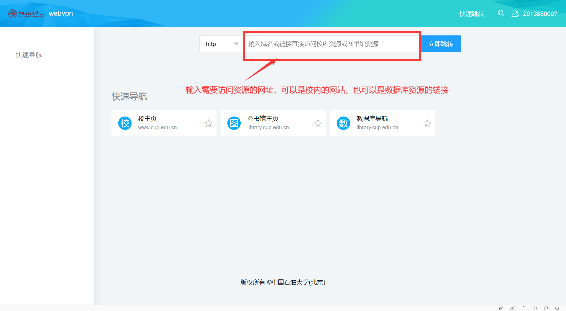 2、除以上方式外,還可以通過“快速跳轉框”直接輸入網(wǎng)址訪問相關資源。示例如下:
