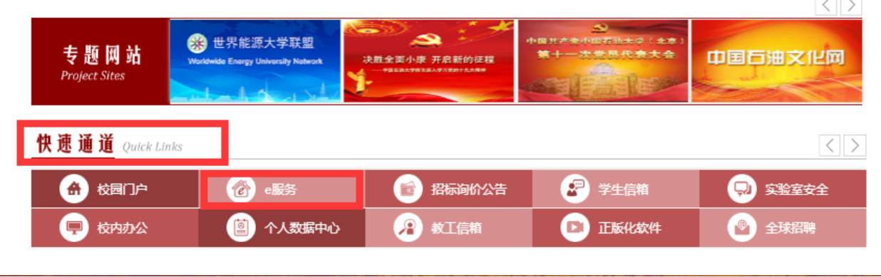 (1)通過校園門戶入口登錄,登錄校園門戶后,在系統入口找到“e服務”平臺,點擊即可單點登錄。